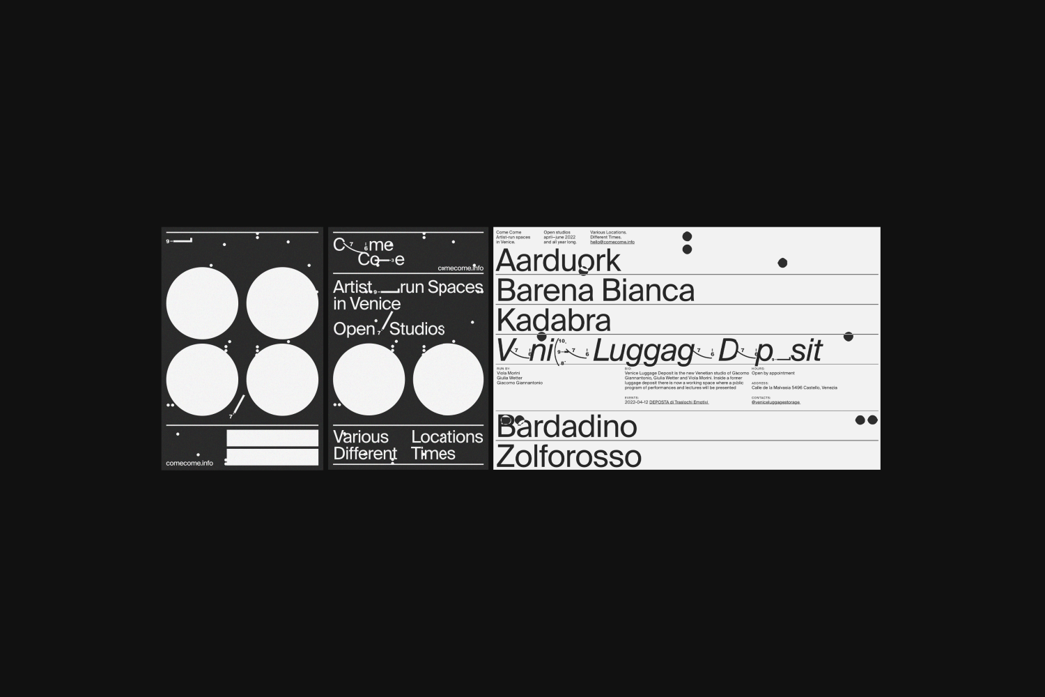 Come Come is an ongoing project which aims to collect the independent art spaces based in the Venice area. It was launched as a collection of open studios events during the Venice Biennale to highlight the local art scene.