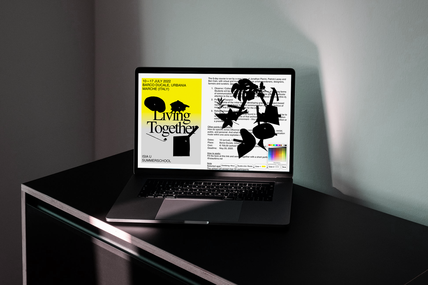 A website for ISIA U Summershool 2022. The page features movable elements and a colour-picker in order to customise a downloadable version of the poster of the school. The typography is set in the default serif and sans-serif font of the browser visiting the page.
